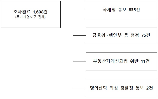 그 결과 편법증여 및 법인탈세 의심사례 총 835건을 적발해 국세청에 통보키로 했다. 이와 별도로 법인대출 또는 사업자대출을 받아 주택구입에 활용한 총 75건을 금융위원회와 금융감독원·행정안전부에 통보했으며, 명의신탁약정 의심사례 2건에 대해서는 경찰청에 고발했다.