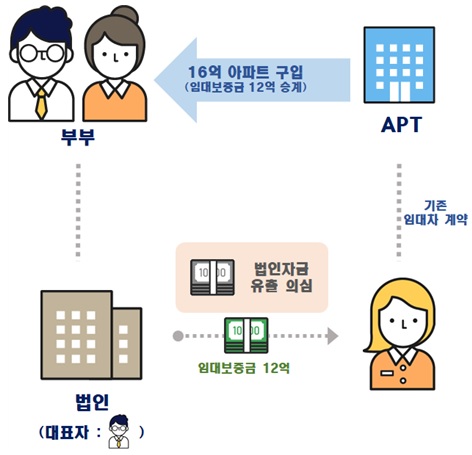 부부관계인 D씨와 E씨는 시세 38억원상당 강남구 아파트를 매수하면서 매수대금 17억원을 부친이 대표로 있는 법인계좌서 지불했고, 부부관계인 F씨와 G씨는 약 16억원짜리 서초구 아파트를 전세 12억원을 끼고 매입, 전세계약 종료시점에 매수인이 대표로 있는 법인계좌서 약 12억원을 이체해 보증금을 상환했다.