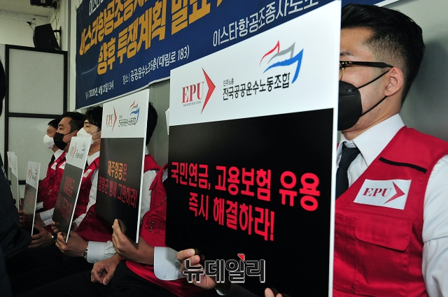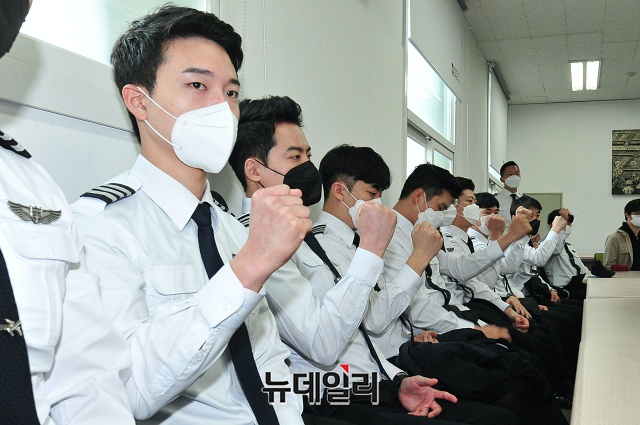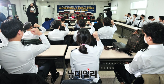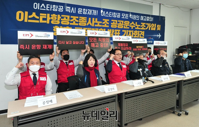 이스타항공조종사노조 조합원들이 22일 오후 서울 영등포구 민주노총 공공운수노조 회의실에서 열린 이스타항공조종사노조 공공운수노조가입 및 향후 투쟁계획 발표 기자회견에서 구호를 외치고 있다.조종사노조측은 △셧다운 조치해제와 즉각적인 운항재개 △정리해고 구조조정의 전면중단 △정부의 고용유지지원제도를 활용한 우선 고용안정 △즉각적인 특별단체협약 등을 요구했다.향후 △전 직원의 고용안정을 위한 직원대책위 구성 △즉각운행재개와 구조조정 중단을 위한 전직원 서명운동 △제주항공과 고용안정 협약 추진 △공공운수노조 항공연대협의회와 연계한 사업추진 등을 주요실천 계획으로 내걸었다.