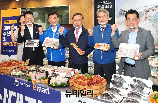 강희석 이마트 대표(왼쪽 두번째부터), 문성혁 해양수산부 장관, 정두한 멍게수협조합장, 홍진근 수협중앙회 대표, 곽정우 이마트 그로서리 본부장이 7일 오후 서울 성동구 이마트 성수점에서 열린 수산물 소비 촉진 행사에서 기념촬영을 하고 있다.