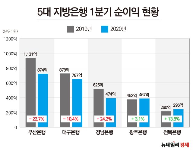 덩칫값 못한 부산·대구·경남…순익 큰 폭↓NIM 연속 내리막길…2분기 추가 하락 전망코로나 비껴간 광주·전북…작년 이어 선방