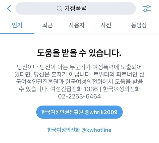 트위터는 한국여성인권진흥원, 한국여성의전화(@kwhotline)와 파트너쉽을 맺고 여성 폭력 피해자 구제를 위한 #ThereIsHelp 기능을 제공한다고 27일 밝혔다.이 기능을 통해 트위터에서 여성 폭력과 관련된 키워드를 검색할 경우 피해자가 도움을 받을 수 있는 유관 단체를 안내하는 메시지가 자동으로 생성된다.전 세계적인 코로나19 사태로 집에서 보내는 시간이 늘면서 가정폭력 사례가 급증하자 이를 예방하고 피해자가 관련 기관으로부터 도움을 받을 수 있도록 한 조치다.트위터의 여성폭력 피해자 지원 #ThereIsHelp 기능은 한국을 포함해 인도네시아, 말레이시아, 필리핀, 태국, 싱가포르, 베트남의 7개 국가에서 제공되며 향후 전 세계로 확대될 예정이다.