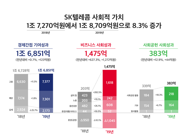 SK텔레콤은 지난해 1조 8709억원의 사회적 가치(SV)를 창출했다고 5월 31일 밝혔다. 이는 2018년 1조 7270억원 대비 8.3% 증가한 결과다.SK텔레콤은 ICT(정보통신기술) 인프라와 기술을 활용해 사회안전망 구축, 국가경제 기여, 사회 문제 해결 등 다양한 SV를 창출하기 위해 총력을 다했다.그 결과, 경제간접 기여성과는 1조 6851억원으로 전년 대비 0.7%, 비즈니스 사회성과는 1475억원으로 627%, 사회공헌 사회성과는 383억원으로 12.9% 증가했다. 다만 환경 공정 영역은 마이너스 폭이 확대돼 보완이 필요한 것으로 나타났다.세부적으로 살펴보면 ‘비즈니스 사회성과’는 지난해 203억 대비 1475억 원으로 627% 늘었다. 해당 영역은 ‘삶의 질’, ‘노동’, ‘동반성장’, ‘환경’ 부분을 포함하고 있다.특히 ‘삶의 질’ 부분의 SV는 전년비 282% 증가한 1618억원으로 측정됐다. 대표적으로 T맵 운전습관 연계 보험 가입자가 대폭 증가하고, 대인사고율이 감소하며 발생한 가치가 전년 대비 2배 이상 늘었다.또한 △독거 어르신 ‘인공지능 돌봄서비스’를 통한 응급 안전알림, 우울감 감소 △고속도로 실시간 급정거 알림을 통한 교통사고 예방 △범죄자 위치추적 고도화를 통한 검거기간 단축 등 사회안전망 구축 일환의 성과가 신규 반영됐다.노동, 동반성장 부분에서 창출한 SV는 각각 242억원, 608억원으로 △장애인 표준사업장 ‘행복한울’ 설립 △2주 80시간 근무제도 정착 △5G·AI 스타트업 발굴 △협력사 기술 개방 등의 노력으로 전년 대비 성과가 높아졌다.재무적 가치와 연동되는 경제간접 기여성과는 1조 6851억원으로 지난해 1조 6728억원 대비 소폭 증가했다. 이 항목을 구성하는 고용, 배당 부분이 각각 11.3%, 1.8% 증가했지만 5G 대규모 투자에 따른 수익 감소로 납세 부분이 25.7% 감소했다.사회공헌 사회성과는 383억원으로 지난해 339억원 대비 약13% 증가했다. 속초·고성 산불, 태풍 현장에 긴급 통신 시설을 구축하는 등 재난 조기 극복 활동과 기부금 확대 등이 반영된 결과다.SK텔레콤은 앞으로 지속적으로 개선해야 할 영역도 있다고 설명했다. 이번 결과에서 환경 공정 부분의 성과는 -1045억원으로 지난해 -950억원 대비 마이너스 규모가 확대됐다.다만 5G 구축시 파워세이빙(Power Saving) 기술을 적용하고, LTE·3G네트워크 저전력화 업그레이드로 전력 효율성을 높여 장비 총량은 23% 늘어났다. 성과 규모는 10% 수준으로 조정되는 등 개선 노력이 있었다.SK텔레콤은 이번 결과를 겸허히 살펴 친환경 기술 개발 및 장비 구축, 빌딩 에너지 관리 시스템 보급도 확대할 예정이다. △중고 휴대폰 재활용 △플라스틱 배출량 줄이기 △유통망 전자청약서 도입 등 제품·서비스 영역의 친환경 활동 노력도 강화할 예정이다.SK텔레콤은 올해부터 주요 이해관계자가 중요하게 여기는 SV 영역을 조사해 사회가 원하는 활동을 적시에 판단하고 전략 수립에 활용키로 했다. 회사가 중요하다고 생각하는 영역보다는 이해관계자의 의견을 더욱 경청해 어떤 영역의 활동을 강화할 지 정확히 판단하겠다는 의미다.이와 연계한 심층 조사에서 고객, 협력사, 주주, 구성원 등은 SK텔레콤이 △삶의 질 △고용 △납세 △환경 영역의 활동을 중점 추진해야 한다는 의견을 전했다.SK텔레콤은 경제적 가치와 사회적 가치의 동반 상승을 위해 5G·AI 등 디지털을 활용한 사회 문제 해결 강화, 융합보안 · 실시간 관제 등 사회안전망 구축, 언택트 서비스 확대 등 새로운 SV 활동을 강화할 계획이다.정밀 위치 측위 기술을 활용해 코로나 확산 역학 조사를 신속 지원하고, 디지털 워크(유연 재택근무제)를 선제적으로 시행하는 등 새로운 방향의 SV를 추진하고 있다.측정 체계를 상세 검토 중인 거버넌스 영역에서도 투명성과 책임경영의 기반 아래 기업가치 제고와 주주이익 극대화 노력을 지속하고 있다. 사업별 최적 운영을 위해 MNO(이동통신)와 신사업(New Biz.) 운영체계를 이원화하는 듀얼OS 체제를 도입했으며, 온라인 주주총회를 통해 경영 구조 개선, 소액주주 권익 보호에도 적극 나선다.박정호 SK텔레콤 사장은 “코로나로 바뀐 언택트 사회, 일상에 맞게 디지털 라이프 패러다임을 혁신할 새로운 사회적 가치 활동을 추진하겠다”며 “국가, 사회 위기를 ICT로 조기 극복할 수 있도록 새로운 사회안전망 서비스 개발 등에 당사가 할 수 있는 모든 방안을 강구할 것”이라고 밝혔다.