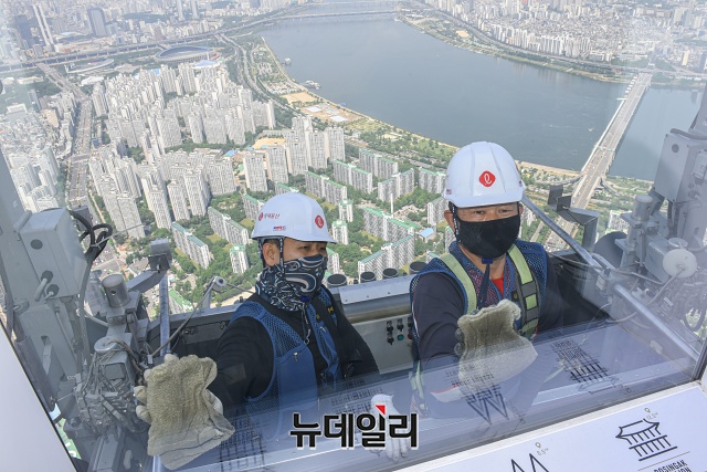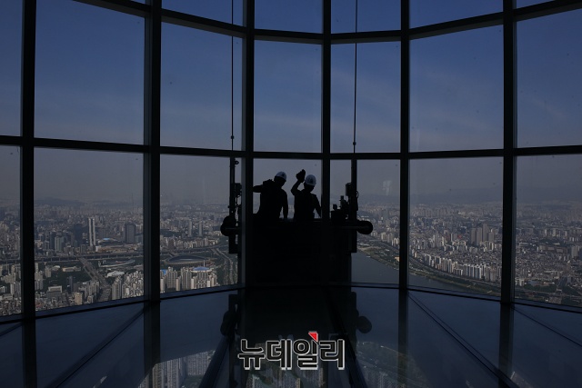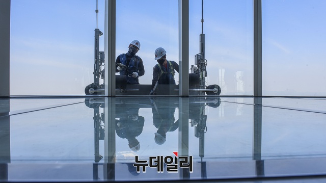 롯데물산이 9일 오전 서울 송파구 롯데월드타워 118층 전망대에서 외벽 유리창 청소를 공개했다.