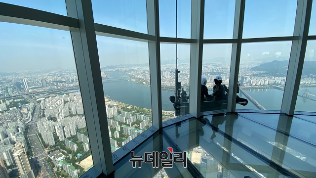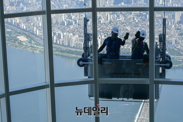 롯데월드타워는 지난달 26일부터 123층 4만 2천여 장의 외벽 유리창 청소를 시작했다. 1분에 1장씩 청소할 경우 약 700시간(3개월/하루8시간 기준)이 소요된다.