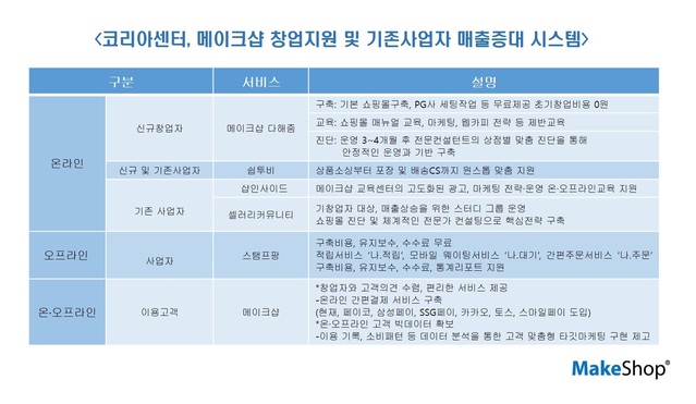 코리아센터는 언택트(비대면) 소비시대에 발맞춘 메이크샵의 체계적인 창업지원 시스템 고도화와 간편결제 서비스 확대에 나선다고 10일 밝혔다.지난 4월 메이크샵 신규쇼핑몰 수는 전월비 206.5%, 전년대비 51.7% 증가했다. 5월까지 두 달 동안의 누적 신규 쇼핑몰 수도 전년대비 49.8% 늘어나 상승세를 유지하고 있다.메이크샵 다해줌은 신규창업자들을 위한 서비스로, 초기 쇼핑몰구축부터 교육과 컨설팅까지 모두무료로 지원하는 창업프로젝트다. 시즌2가 시작된 지난 3월부터 현재까지 신청자 수는 전년대비 30%이상 증가했다.기운영 중인 사업자를 대상으로 매출상승을 위한 교육과 컨설팅도 제공하고 있다. 쇼핑몰 운영에 필요한 제반교육을 온·오프라인을 활용해 탄력적으로 운영중이다.창업컨설팅 셀러리커뮤니티를 통해 기 운영중인 사업자를 대상으로 진행되는 그룹별 공부모임도 인기가 높다. 온·오프라인 상에서 정보와 의견을 공유하고 기획과 마케팅에 관한 과제를 해결하는 교육형태다. 현재는 코로나19로 인해 라이브 방송으로 교육을 진행하고 있다.상품 소싱부터 배송CS까지 원스톱으로 진행해주는 무재고 창업 맞춤 쉽투비 서비스와 줄서거나 기다리지 않아도 되는 '나.대기', 간편하고 간단하게 주문하는 '나.주문', 잃어버리기 쉬운 종이 쿠폰을 대신하는 '나.적립' 등의 비대면(언택트) 솔루션 역시 포스트 코로나 시대에 주목을 받고 있다.이용고객들을 위한 쇼핑환경 제고에도 적극 노력하고 있다. 올초 스마일페이와 토스를 도입해 현재까지 페이코, 삼성페이, 카카오페이 등 총 6개의 간편결제 서비스 도입을 무료로 진행하고 있다.향후 코리아센터는 쇼핑몰 이용고객들의 소비패턴과 성향 등을 파악해 빅데이터를 활용한 고객맞춤형 타깃 마케팅도 구현할 계획이다.