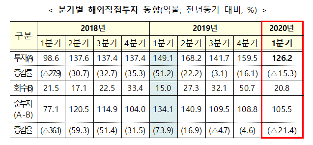 코로나19 팬데믹으로 전 세계적으로 봉쇄조치가 시작된 3월 한국의 해외직접투자액이 45.6% 줄어드는 등 반토막이 난 것으로 나타났다.기획재정부는 올해 1분기(1~3월) 투자액은 126억2000억 달러로 전년대비 15.3% 줄었다고 밝혔다. 해외직접투자액이 감소한 것은 신흥국 위기로 위축됐던 2018년 1분기 이후 처음이다.1~2월은 전년동기 대비 유사한 수준이었지만 3월 들어 투자액이 급감하며 투자감소 영향이 나타났다고 기재부는 설명했다. 순투자액은 105억5000만달러로 전년동기 대비 21.4% 감소했다.