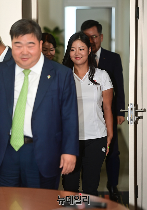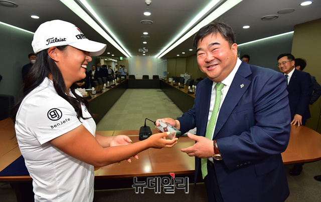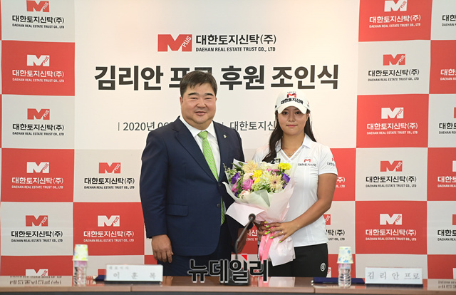 2020년 신인왕 후보로 유력한 프로골퍼 김리안 선수가 23일 오전 서울 강남구 대한토지신탁 대회의실에서 후원 조인식을 마친 직후 이훈복 대한토지신탁 대표에게 사인볼을 건네고 있다.대한토지신탁은 김 선 수에게 2020년 6월부터 공식 메인 스폰서로 후원한다. 시즌 성적에 따라 별도의 인센티브도 지급할 예정이다.이날 조인식에는 김 선수와 김 선수 가족을 비롯해 후원사인 대한토지신탁㈜ 이훈복 대표이사, 변재선 경영부문 이사, 박진규 영업부문 이사 등 관계자들이 참석했다. 사회는 주교빈 아나운서가 맡았다.