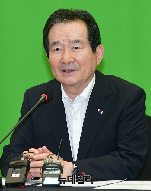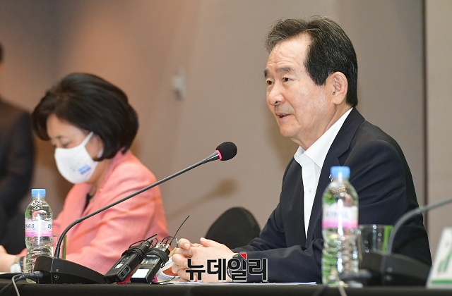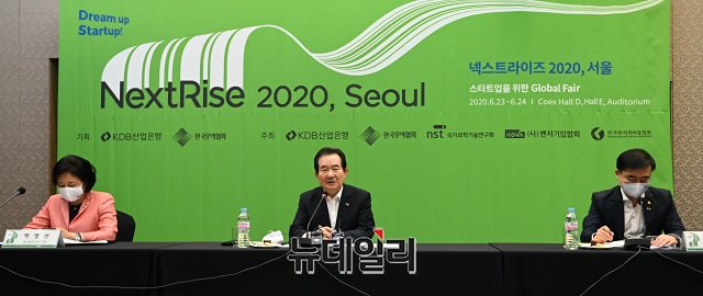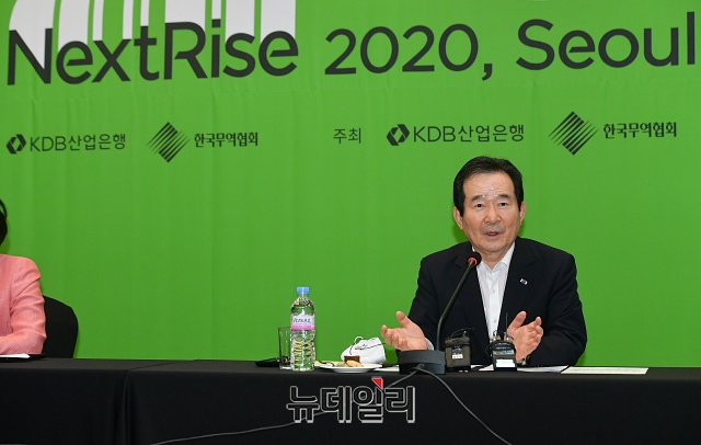정세균 국무총리가 23일 오후 서울 강남구 코엑스에서 열린 '넥스트라이즈 2020' 기업인들과 간담회에서 인사말을 하고 있다.
