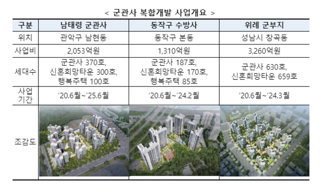 서울 동작구 수방사와 관악구 남태령 군관사, 성남 위례 군부지에 신혼희망타운과 행복주택 등 공공주택 1314호가 공급된다.기획재정부는 국유재산 정책심의위원회 부동산 분과위원회를 개최하고 군관사와 청년‧신혼부부를 위한 공공주택을 복합개발하는 국유재산 위탁개발 사업계획(안) 3건을 심의·의결했다고 1일 밝혔다.승인된 3개 사업은 저활용 군(軍)부지(남태령, 동작, 위례)에 총사업비 6622억원을 투자해 군관사 1187호와 함께 신혼희망타운(분양형) 1129호, 행복주택(임대형) 185호를 공급하는 사업이다.동작‧위례 두 사업은 2021년 중 주택사업승인 등 인허가 절차를 거쳐 2024년 완공될 계획이다. 또 남태령 군관사는 2025년 완공예정이다.주거비 부담이 큰 수도권 지역에 공공주택을 공급함으로써 수도권 주택시장 안정에 다소 기여할 것으로 기재부는 기대했다.세부내용을 살펴보면 관악구 남현동에 위치한 남태령 군관사에 2053억원을 들여 군관사 370호, 신혼희망타운 300호, 행복주택 100호를 짓는다. 동작구 본동 수방사 부지에는 1310억원을 투입해 군관사 187호, 신혼희망타운 170호, 행복주택 85호가 들어선다. 성남 창곡동 위례 군부지에는 군관사 630호 신혼희망타운 659호가 입주하며 사업비는 3260억원이다.신혼희망타운은 전용 55㎡ 규모로 혼인 7년 이내 소득‧자산 요건을 충족하는 무주택세대가 청약이 가능하다. 또 분양가상한제를 적용해 시세보다 저렴하게 공급되며, 정확한 분양가는 2022년 이후 분양시점에 확정된다.청년‧신혼부부 등을 위한 임대주택인 행복주택은 44~55㎡ 규모 185호로, 시세대비 70% 내외의 임대료로 최장 6~20년간 거주할 수 있다.기재부는 "2018년부터 청년층 주거지원 등 국유재산의 공익적 활용 확대를 위해 공공청사를 신혼희망타운 등 공공주택과 복합개발하는 사업을 추진 중"이라며 "현재까지 사업 대상지로 선정한 총 16곳 중 13곳의 사업계획 승인을 완료하게 된다"고 설명했다.