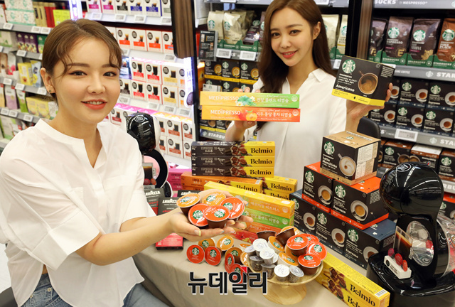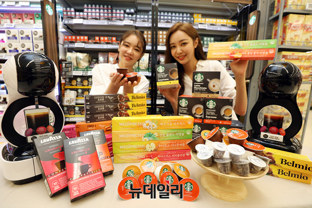 이마트가 7일 오전 서울 성동구 성수점에서 라바짜, 벨미오, 스타벅스, 메디프레소 등 다양한 '캡슐 커피/티'를 소개하고 있다.이마트는 지난해 스타벅스 캡슐 커피 출시에 이어 올해 6월 라바짜, 벨미오, 메디프레소 등 새로운 캡슐 커피/티를 선보이며 캡슐 상품 종류를 대폭 확대했다.9일부터 15일까지 라바짜와 벨미오 캡슐 2개 구매 시 10%, 3개 구매 시 15% 할인 판매하는 행사를 진행한다. 또 캡슐로 즐길 수 있는 차, '캡슐 티(Tea)'도 확대 판매한다. (사진=이마트)