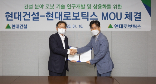 현대건설이 16일 서울 종로구 계동 현대빌딩에서 현대로보틱스와 '건설 로보틱스분야 연구협력'에 대한 양해각서(MOU)를 체결했다.