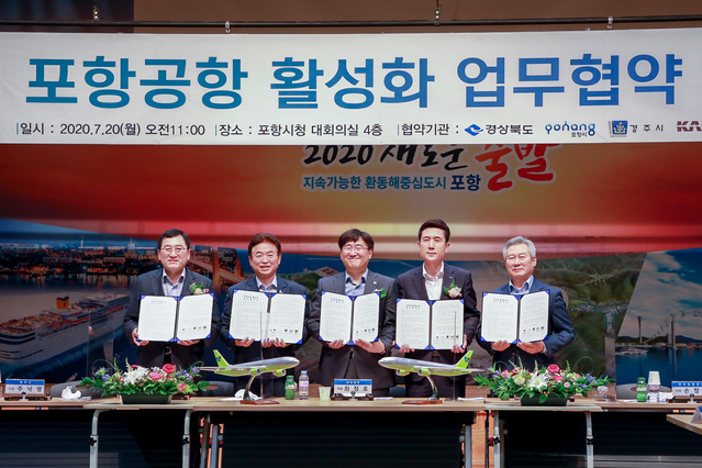 진에어가 포항공항 활성화를 위해 지역과 손을 맞잡았다.진에어는 20일 오전 포항시청 대회의실에서 지역공항 활성화 업무협약(MOU)을 체결했다.협약식에는 최정호 진에어 대표, 이철우 경북도지사, 이강덕 포항시장, 주낙영 경주시장, 손창완 한국공항공사장 등 주요 관계자들이 참석했다.최정호 대표는 "시도민들께 편리함과 가격 경쟁력을 갖춘 항공 서비스를 제공해 드릴 수 있게 되어 기쁘게 생각한다"며 "지속적인 관심과 사랑을 부탁드리고 진에어는 진심 어린 서비스로 보답하겠다"고 말했다.이번 협약에 따라 진에어, 경상북도, 포항시, 경주시, 한국공항공사는 적극적인 교류에 나선다.진에어는 시도민의 항공교통 편의를 위해 노선 확충과 안정적인 운영을 위해 노력할 계획이다. 각 시도와 기관은 지속적인 지원, 홍보, 시설 개선에 힘쓸 예정이다.진에어는 이달 31일부터 포항공항을 거점으로 김포공항과 제주공항을 잇는 신규 노선을 개설한다.해당 노선은 김포에서 매일 오전 9시 5분 출발해 10시 포항에 도착한다. 포항에서는 19시 출발해 김포에 20시 도착한다.포항~제주 노선 스케줄은 매일 10시 40분, 15시 40분 출발한다.