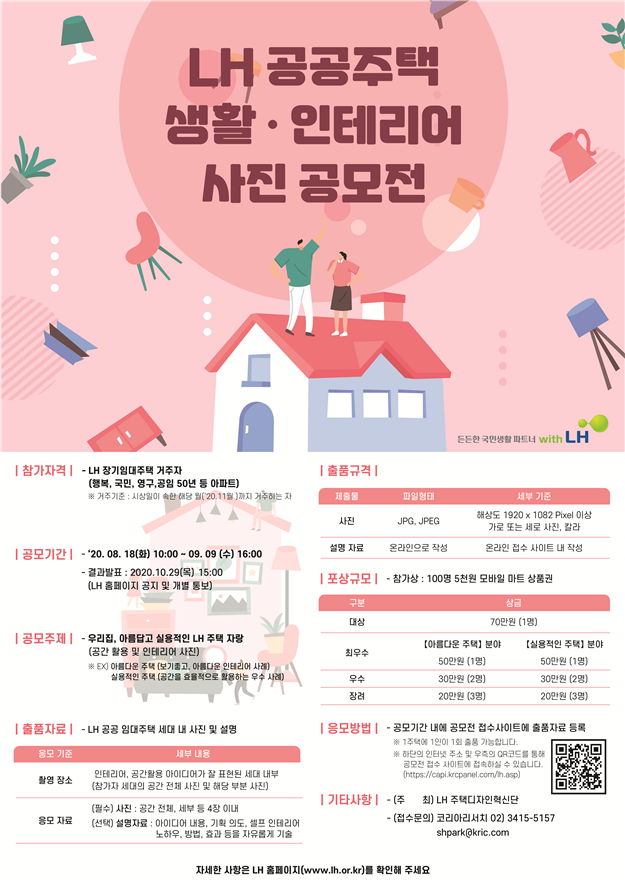 LH가 건설한 장기임대주택에 거주하고 있는 입주민이라면 누구나 참여 가능하며 참가자의 주거공간 활용 아이디어가 잘 드러나도록 세대 내부 사진을 찍고 공모 접수 사이트로 제출하면 된다.
