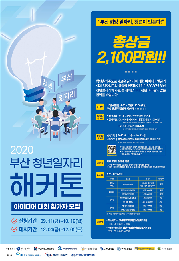 주택도시보증공사(HUG)가 부산광역시와 부산경제진흥원, 지역대학 일자리센터 등이 주관하는 '2020년 부산 청년일자리 해커톤 대회'를 지원한다고 16일 밝혔다.
