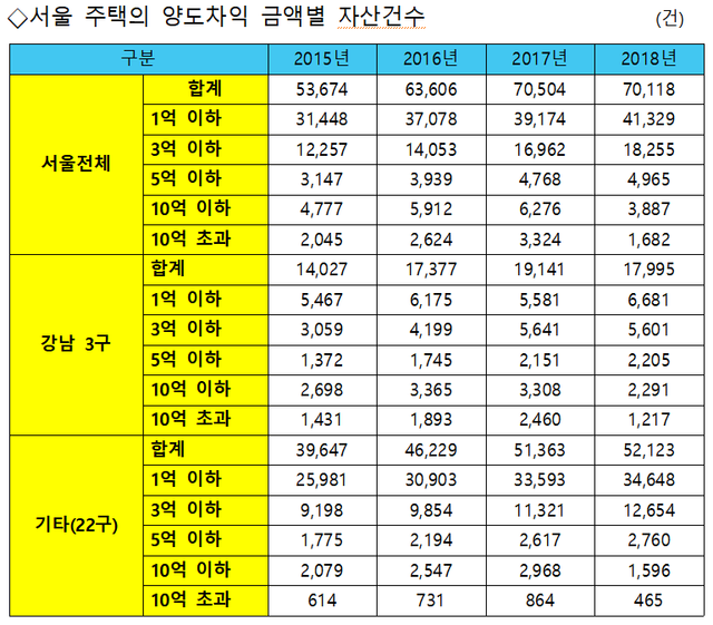 서울에서 2015년부터 2018년까지 매매된 주택 중 양도차익이 10억원을 초과하는 주택이 약 1만가구에 이르는 것으로 나타났다.
