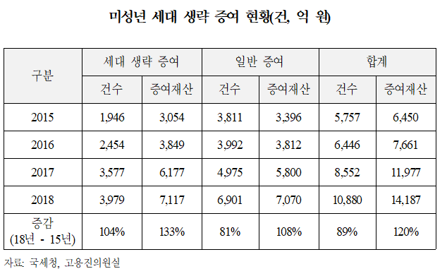 미성년 손주에게 재산을 물려주는 행태가 급증한 것으로 나타났다. 종합부동산세 등 보유세가 가파르게 오르고, 증여세도 강화되면서 자식을 거치지 않고 일찍부터 손주에게 부동산 등을 물려주는 것이다.12일 국회 기획재정위원회 소속 고용진 더불어민주당 의원이 국세청에서 받은 자료에 따르면 미성년 증여의 절반은 세대를 건너뛰고 조부모로부터 물려받은 것으로 나타났다. 미성년 세대 생략 증여는 2018년 기준 7117억 원으로 전체 미성년 증여(1조4187억)의 50.2%를 차지했다.조부모가 자녀 세대를 건너뛰어 손주에게 직접 증여하는 세대생략 증여는 자녀 세대에서 손자녀 세대로 증여할 때 부담해야 하는 증여세를 회피할 수 있다. 이를 방지하기 위해 세대를 건너뛴 증여에 대해서는 할증 과세를 하고 있지만 실효성이 적다고 고 의원은 지적했다.현행 세법은 세대 생략 증여의 경우 30%를 할증한 증여세를 과세하는데 20억원 이상의 재산을 미성년자에게 증여할 경우 최대 40%까지 할증된다.하지만 이같은 할증 과세에도 2015년 3054억(1946건)이었던 미성년 세대 생략 증여는 2018년 7117억(3979건)으로 불과 3년 만에 133% 증가했다. 건당 증여액도 1억 5693억원에서 1억7886억원으로 늘었다. 전체 미성년 증여에서 세대 생략 증여가 차지하는 비중은 2015년 47.3%에서 2018년 50.2%로 증가했다.특히 7세 미만 미취학아동에게 물려준 세대 생략 증여는 2018년 한해만 2414억원에 달했다. 초등학생은 2163억원, 중학생 이상은 2540억원이었다. 자녀의 연령이 낮을수록 세대 생략 증여를 조기 증여의 수단으로 활용하고 있다는 얘기다.세대 생략 증여는 두 번의 세금을 한 번으로 가늠할 수 있어 부유층의 합법적 절세 창구로 활용되는 셈이다. 실제로 건당 증여금액을 일반 증여와 비교하면 미성년 세대 생략 증여는 건당 1억7886만원으로 일반 증여(1억244만원)보다 크게 높다.또 미성년 증여는 현행 종부세법이 세대별 합산을 하지 않는다는 점을 이유해 다주택자 규제나 소득세 회피의 수단으로도 활용되고 있다고 고 의원은 지적했다.고 의원은 "현행 세대 생략 할증 과세가 제 기능을 하지 못하고 있다"며 "경제활동 능력이 없는 미성년들이 자기 돈으로 제대로 증여세를 납부했는지, 자금출처나 증여세 탈루 여부에 대해 꼼꼼히 들여다봐야 한다"고 말했다.