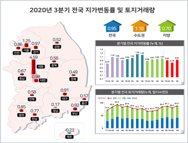 26일 국토교통부가 발표한 올해 3분기 전국 지가변동률 및 토지거래량에 따르면 시군구별로 전분기 대비 가장 땅값이 많이 오른 곳은 4.59% 오른 세종시다.