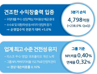 우리금융그룹이 3분기 연결 기준 당기 순이익이 4800억원을 기록했다. 2분기 순익 1465억원 보다 238% 증가한 수준이다. 코로나19 악재 속 견조한 수익창출력을 보였다는 평가다.26일 우리금융이 발표한 3분기 실적발표에 따르면 주요 자회사별 3분기 연결 순익은 그룹내 가장 비중이 큰 우리은행이 4807억원을 기록, 우리카드 278억원, 우리종합금융 187억원 순으로 나타났다.이자이익과 비이자이익으로 구성된 순영업순익은 전분기대비 5.0% 증가한 1조7141억원을 달성했다.이자이익은 상반기 두차례 금리인하에 따른 수익성 하락 우려에도 전분기보다 0.6%p 증가한 1조4874억원을 기록했다.이에 우리금융은 "중소기업 중심의 대출성장과 핵심 저비용성예금 증가에 따른 수익구조 개선 결과"라고 설명했다.비이자이익은 3분기 중 '사회적거리두기 2.5단계' 상향에도 영업력을 회복해 외환/파생 관련 이익 등의 증가로 2267억원을 시현했다.자산건전성 부문은 고정이하여신(NPL)비율 0.40%, 연체율 0.32%를 유지했다.특히, 우량자산비율 86.9%, NPL커버리지비율 152.7%도 안정적으로 보였다.BIS 자본비율 역시 지난 6월 감독당국의 내부등급법 승인에 이어 바젤Ⅲ 최종안을 조기 도입해 14% 수준으로 개선되며 불확실한 금융환경에 대처할 여력을 높였다.우리금융그룹은 지난 23일 이사회를 열어 아주캐피탈 경영권 인수를 결의했다. 아주캐피탈 인수시 아주캐피탈의 100% 자회사인 아주저축은행은 손자회사로 편입된다.우리금융은 "코로나19로 인한 국내 금융환경의 불확실성이 여전한 상황임을 감안해 견조한 펀더멘탈의 업그레이드와 그룹내 사업포트폴리오간 시너지 강화 등 그룹의 내실화에 주력할 것"이라고 말했다.