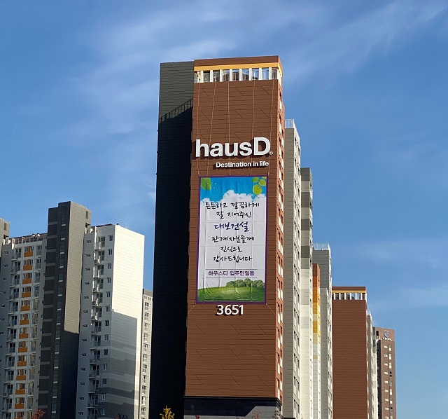 대보건설이 시공한 경기 화성 '동탄 하우스디 36단지' 외벽에 입주민 감사 현수막이 걸려 눈길을 끈다.