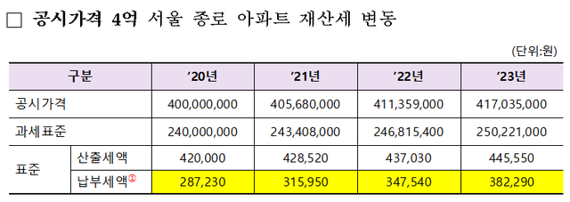 현재 공시가격 4억원짜리 서울 종로구의 아파트는 올해 재산세로 28만7230만원을 냈다. 공시가격이 1%씩 오른다고 가정했을때 내년엔 31만5950만원, 2022년엔 34만7540만원, 2023년 38만2290만원 등으로 3년새 10만원 가량 오른다.