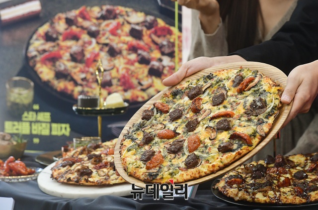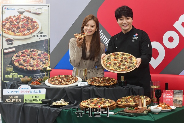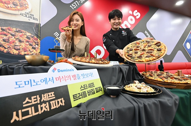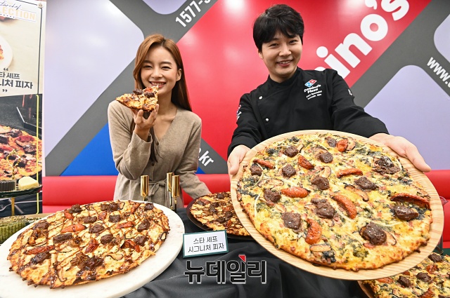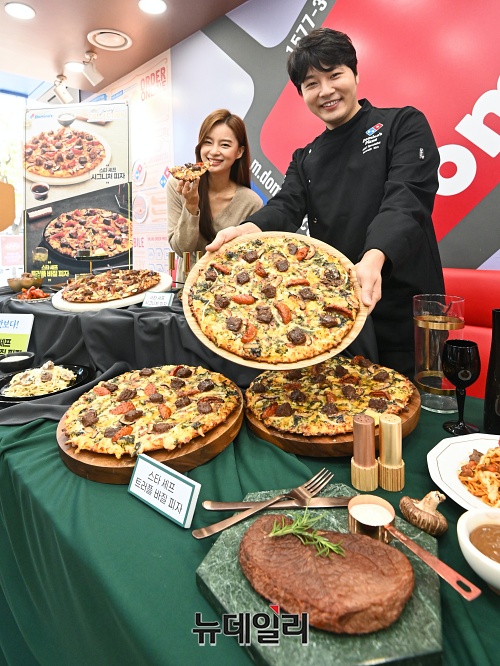 도미노피자가 10일 오전 서울 중구 명동점에서 겨울 신제품 '스타 셰프 시그니처 피자' '스타 셰프 트러플 바질 피자' 2종으로 구성된 '스타 셰프 컬렉션'을 선보이고 있다.'스타 셰프 컬렉션'은 미쉐린 가이드 서울 1스타에 선정된 레스토랑 '무오키' 박무현 오너 셰프와 협업한 제품이다. 드라이 에이징 스테이크와 시그니쳐 스테이크 소스가 조화를 이룬 '스타 셰프 시그니처 피자'와 바질페스토 소스 위에 드라이 에이징 스테이크를 올린 '스타 셰프 트러플 바질 피자' 2종으로 구성됐다.'스타 셰프 컬렉션 피자' 가격은 라지 사이즈 36,900원, 미디움 사이즈 29,900원이다.