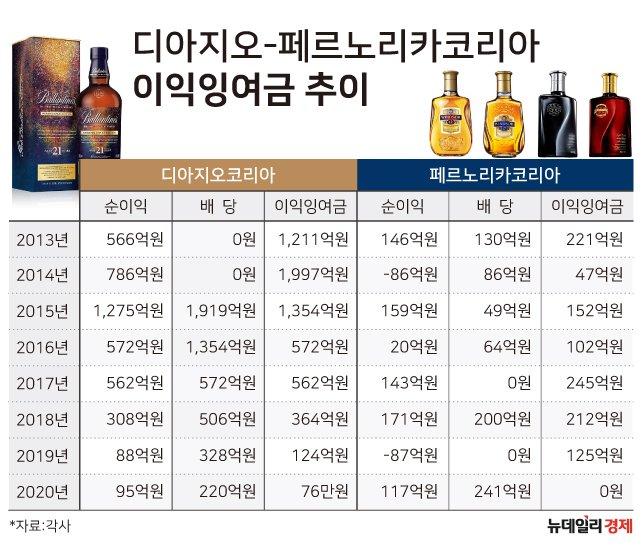 국내 양대 위스키 기업인 디아지오코리아와 페르노리카코리아의 배당잔치가 사실상 올해로 끝날 전망이다. 수백억원 가량 쌓아뒀던 사내유보금(이익잉여금)이 수년간 막대한 배당으로 인해 바닥났기 때문이다.한해 벌어들인 순이익보다 높은 배당성향을 이어온 끝에 벌어진 결과다. 이 때문에 주류업계 일각에서는 이들이 국내 시장의 사업을 축소하거나 철수를 준비하지 않겠냐는 우려까지 나온다.25일 주류업계에 따르면 디아지오코리아와 페르노리카코리아는 올해를 기점으로 미처분이익잉여금이 바닥을 드러냈다. 신종 코로나바이러스 감염증(코로나19)으로 실적이 크게 악화된 올해까지 막대한 배당을 이어가며 사실상 국내법인의 자금을 주주사에 보낸 탓이다.디아지오코리아는 지난 9월 연차배당을 통해 220억원의 배당을 진행했다. 지난 회계연도(19년 7월~20년 6월) 기준 순이익인 95억원의 2배 웃도는 금액이다. 배당률은 231.2%로 지난해 345.2%보다 줄었지만 이는 디아지오코리아의 보유자금에 따른 것으로 보인다.이번 배당 이후 디아지오코리아의 남은 이익잉여금 규모는 총 76만원 뿐이다. 지난 2014년 기말 기준 1402억원에 달했던 이익잉여금이 불과 6년만에 바닥을 보이게 된 셈이다.