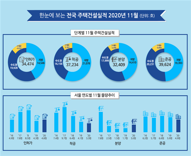 30일 국토부가 발표한 '2020년 11월 전국 주택건설실적'에 따르면 지난달 전국 주택 인허가 실적은 3만4474가구로 전년 동월(3만3368가구) 대비 3.3% 증가했다. 전달(3만3257가구)에 비해서도 3.7% 늘었다.