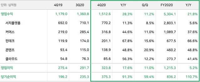 네이버가 지난해 1조원이 넘는 영업이익을 거두면서 역대 최고 실적을 올렸다.28일 네이버에 따르면 2020년 매출 5조 3041억원, 영업이익 1조 2153억원으로 전년 대비 각각 21.8%, 5.2% 증가했다.연간 영업이익은 2017년 이후 3년 만에 다시 1조원을 넘었다. 4분기 매출은 1조 5126억원(11.2%), 영업이익은 3328억원(11.0%)으로 전년 대비 두 자릿수 증가율을 보였다.이 같은 호실적은 쇼핑·콘텐츠·핀테크 등 신규 사업의 성장이 이끈 것으로 분석된다.검색·광고 부문인 서치플랫폼의 연간 수익은 2조 831억원으로 지난해보다 5.6% 증가했다. 4분기 매출은 7702억원으로 전분기 대비 8.5% 성장했다.쇼핑 등 커머스 부문 매출은 3168억원으로 전년 대비 37.6% 늘었으며, 전분기 대비 11.0% 증가했다.간편결제·디지털 금융 등 핀테크 부문의 연간 매출은 6775억원으로 전년 대비 66.6% 증가했다. 분기 기준으로는 3분기보다 15.6% 증가한 2011억원의 매출을 올렸다.콘텐츠 부문 매출은 웹툰의 글로벌 성장으로 전분기 대비 20.9% 성장한 1389억원을 기록했다. 연간 기준으로는 48.8% 성장한 4602억원으로 집계됐다.클라우드의 연간 매출은 전년 대비 41.4% 증가한 2737억원을 기록했다. 4분기에만 856억원의 매출을 올리면서 3분기보다 12.2% 성장했다.한성숙 네이버 대표는 "코로나19 위기 속 네이버의 기술과 서비스를 활용해 SME들과 함께 의미 있는 성장을 실현한 한 해였다”며 “연간 25% 규모의 R&D 투자를 더욱 높여가는 등 적극적인 연구개발, M&A, 제휴를 진행할 것”이라고 말했다.