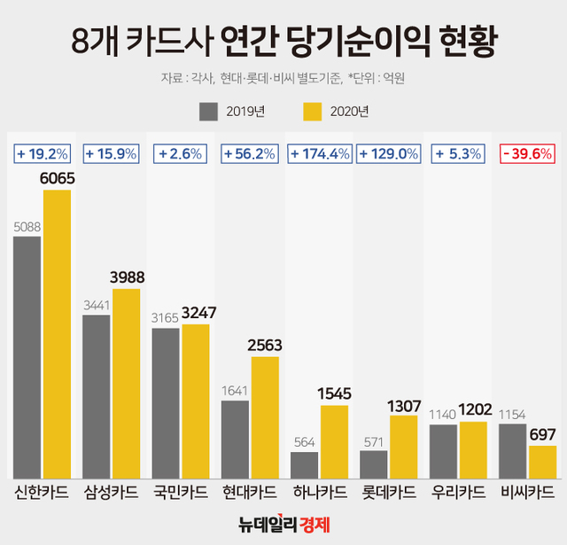 카드사들이 지난해 국내 경제를 강타한 코로나19 불황에도 불구하고 실적 고공행진을 이어갔다.마케팅 비용 절감 효과에 더해 전통적 사업모델에서 벗어난 포트폴리오 다각화를 통해 성장세를 이끌었다. 재난지원금 지급과 비대면 소비 확산도 한 몫 했다.◆1위 신한·2위 삼성…대규모 충당금 적립에도 선방8일 금융권에 따르면 신한, 삼성, 국민, 현대, 하나, 롯데, 우리, 비씨 등 8개 카드사 중 비씨카드만 제외하고 지난해 당기순이익이 일제히 개선됐다.카드사 중 가장 높은 순이익을 낸 곳은 신한카드로 전년 대비 19.2% 증가한 6065억원을 시현했다. 지난 한 해 1084억원의 대규모 충당금 적립에도 양호한 성적을 거뒀다.신한카드 관계자는 "자동차 할부금융 및 리스금융, 장기렌탈 등 중개수수료, 신금융상품 확대 등 사업 포트폴리오를 다변화하고 재난지원금 등 유동성 공급에 따른 건전성 개선으로 선방했다"고 설명했다.실제 영업수익을 보면 신용카드는 전년 대비 2.9% 증가에 그친 반면 할부금융은 9.4%, 리스는 44.5% 급증했다.다만, 4분기 순이익만 보면 18.7% 감소했다. 건전성 악화에 대비한 미래 경기전망을 보수적으로 반영해 4분기에만 739억원의 충당금을 쌓은 탓이다.충당금 적립에 따른 대손비용 증가와 더불어 신규 우대가맹점 수수료 환급 등 규제 영향에 따른 수익 감소, 자산 성장에 따른 지급이자 증가가 순이익 증가세를 다소 억제했다.2위인 삼성카드는 전년 대비 15.9% 증가한 3988억원의 순이익을 냈다. 경기전망에 대한 보수적 가정 및 모형 변경으로 1000억원의 충당금을 쌓았으나 순이익은 증가했다.지난해부터 조달 비용률 하락세가 지속된데다 판관비가 줄어든 게 순이익을 끌어올렸다. 판관비는 여행·레저 부가서비스와 국제수수료 등 카드서비스 비용 감소와 더불어 모집인수수료 감소 및 차세대시스템 감가상각비 축소로 전년 대비 5.9% 감소했다.현대카드의 성장세도 주목할만하다. 연간 순이익은 2563억원으로 전년 대비 56.2% 증가했다. 대면 마케팅이 제한되면서 비용 절감 효과가 컸고, PLCC(상업자 표시 전용카드) 전략을 통한 신규 회원 확대, 신용판매(일시불·할부) 및 카드대출 취급액 증가 등 매출 증대로 순이익이 개선됐다.◆중소형사 엎치락뒤치락…하나카드 약진 두드러져중소형 카드사의 경우 대형사보다 더 치열한 경쟁을 벌였다. 연간 순이익으로 하나카드가 우위를 선점했고, 우리카드가 뒤로 밀려났다.하나카드는 전년 대비 174.4% 급증한 1545억원의 순이익을 달성했다. 결제성 수수료 증대와 디지털 혁신에 따른 비용 효율화 등의 영향이 컸다.특히 전반적인 신용카드 유치 및 발급, 상품 포트폴리오 개선, VAN수수료 절감 등 디지털 프로세스 개선을 통해 업무 비용이 크게 줄었고 마케팅 비용 절감 효과 역시 컸다.반면 코로나19에 따른 소비패턴 변화로 온라인 업종 취급액은 전년 대비 33.7% 증가했고, 회원 기반의 수익성 다양화와 금융 수익도 일부 늘었다.하나카드 관계자는 "코로나19 로 해외매출 등의 큰 감소가 있었으나 수수료 비용 및 판관비 절감과 자산건전성 확장 및 리스크 관리 강화 정책을 통해 높은 실적을 시현했다"고 설명했다.롯데카드 역시 전년 대비 129% 급증한 1307억원의 순이익을 기록했다. 지난해 인수합병(M&A) 이후 빠르게 정상화를 이뤄냈고 수익성 중심의 포트폴리오 조정으로 수익성을 끌어올렸다.롯데카드 관계자는 "지난해 MBK 파트너스의 인수 이후 빠른 정상화와 수익성 확대, 마케팅 비용 효율화 등을 통해 순이익이 개선됐다"고 설명했다.카드사 중 유일하게 성장이 정체된 곳은 비씨카드다. 연간 순이익은 697억원으로 전년 대비 39.6% 급감했다. 대금 결제업무를 수행하는 매입업무수익이 크게 줄어든 탓이다.