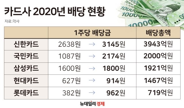 카드사들이 지난해 코로나19 사태에도 높은 이익성장을 바탕으로 배당금을 크게 늘리며 역대급 배당 잔치를 벌였다.금융당국으로부터 배당 축소를 압박받는 은행 및 보험사와는 달리 자유로운 분위기에서 주주가치를 제고하며 고배당 기조를 이어가는 모습이다.10일 업계에 따르면 신한, 삼성, 국민, 현대, 롯데 등 5개 카드사의 2020년 배당금총액은 1조50억원으로 2019년(7306억원)보다 37.6% 급증했다.1주당 배당금을 가장 많이 늘린 곳은 국민카드다. 2019년 레버리지 비율 관리를 위해 일시적으로 2019년 배당을 1087원으로 줄였다가 2020년 2174원으로 2배 상향했다. 배당총액 역시 100% 뛰었다.배당 규모가 가장 큰 신한카드는 주당 배당금을 2638원에서 3145원으로, 배당총액은 3307억원에서 3943억원로 확대했다. 2년 연속 배당을 확대한 현대카드는 주당 914원, 총 1467억원의 배당을 결정했다.