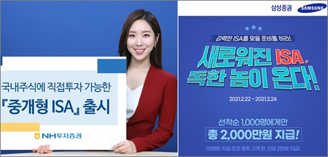 국내 증권사들이 중개형 개인종합자산관리계좌(ISA) 유치 경쟁을 본격화하고 있다.23일 NH투자증권은 고객이 직접 주식과 금융상품을 거래하고 비과세 혜택을 받을 수 있는 중개형 ISA를 오는 25일 출시한다고 밝혔다.NH투자증권은 이를 기념해 이날부터 올해 연말까지 중개형 ISA를 가입한 고객에게 해당 계좌에서 국내 상장주식을 거래할 경우 주식매매수수료를 무료(유관기관수수료 무료)로 제공하는 이벤트를 진행한다.또한 오는 6월 30일까지 ISA 내 주식 또는 금융상품을 1000만원 이상 가입한 고객 중 추첨을 통해 140명에게 1000만원 한도로 연 14%(세전) 특판RP(91일물) 가입 혜택을 제공하는 이벤트도 동시에 실시한다.NH투자증권은 중개형 ISA의 원활한 고객 상담을 지원하기 위해 별도의 상담전담조직을 중개형 ISA 오픈 일정에 맞춰 운영할 방침이다.삼성증권도 같은날 중개형 ISA를 출시한다. 삼성증권은 출시에 앞서 사전신청 이벤트로 '새로워진 ISA, 독한 놈이 온다'를 진행한다.오는 24일까지 회사 홈페이지 또는 모바일 앱 엠팝(mPOP)의 해당 이벤트 페이지에서 이벤트 참여 신청 후 이달 25일부터 3월 31일까지 중개형 ISA를 온라인으로 개설 후 국내주식을 포함한 이벤트 대상 상품을 10만원 이상 온라인으로 매수하고, 3월 31일까지 10만원이상 잔고를 유지하면 된다. 이 조건을 모두 충족한 고객 중 선착순 1000명에게 2만원 상당의 현금 리워드가 지급된다.ISA는 2016년 3월 정부가 국민재산 늘리기 프로젝트 일환으로 도입한 정책금융상품이지만 가입자 제한을 비롯해 긴 의무보유기간 등 제한으로 인기를 얻지 못했다. 하지만 올해 세제개편을 통해 절세계좌로서의 활용 매력이 커졌다.기존에는 소득이 있는 사람만 가입이 가능했지만 올해부터 만 19세 이상이면 소득이 없어도 누구나 가입이 가능해 세제혜택을 받을 수 있는 대상자가 확대됐다. 또한 의무가입기간이 5년에서 3년으로 축소됐고, 만기자금을 연금계좌로 전환할 경우 추가로 세액공제 혜택이 주어진다.특히 새롭게 추가된 중개형 ISA에 대한 고객의 관심이 클것으로 기대된다. 고객이 직접 주식을 매매하고, 상품을 거래할 수 있다는 점이 중개형 ISA의 큰 특징이다. 지금까지 ISA는 고객의 지시를 받아 회사가 운용하는 ‘신탁형 ISA’와 전문FP가 포트폴리오로 운영하는 ‘일임형ISA’ 두가지 유형만 있어 고객의 직접 매매는 불가능했다.중개형 ISA에서 개별 종목을 거래하면 주가 상승 시 수익과 함께 세제 혜택을 동시에 누릴 수 있다. 만약 주가가 하락해 손실이 발생해도 손실금액을 다른 상품의 이익에서 차감하는 손익통산이 적용되기 때문에 일반 주식계좌와 비교 시 절세관점에서 유리하다.