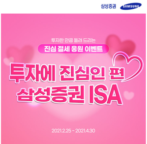 삼성증권은 지난 2월 출시한 중개형 ISA의 사전 이벤트에 이어 추가 이벤트를 진행한다고 12일 밝혔다.이번에 진행되는 중개형 ISA 관련 이벤트는 오는 4월 30일까지 이벤트 조건을 충족하면 현금 리워드를 지급하는 '투자에 진심인 편, 삼성증권 ISA' 이벤트와, 올해 연말까지 진행되는 '계좌개설 축하' 이벤트, 총 두 가지이다.'투자에 진심인 편, 삼성증권 ISA' 이벤트는 4월 30일까지 진행되며, 이벤트 기간 중 모바일앱 엠팝에서 중개형 ISA를 개설한 고객을 대상으로 진행된다.비대면으로 중개형 ISA를 개설한 고객이 이벤트를 신청하면 이벤트 기간 내 순입금 및 거래한 금액에 따라 현금 리워드 혜택을 최대 5만원까지 받을 수 있다.300만원 이상 1000만원 미만 금액을 중개형 ISA에 순입금하고, 이벤트 대상 상품을 순입금액 이상에 해당하는 금액으로 거래하면 3만원 상당의 리워드 혜택을, 1000만원 이상을 순입금 및 거래한 고객의 경우에는 5만원 상당의 리워드 혜택을 받는다. 다만 리워드 혜택을 받으려면 5월 31일까지 순입금액 이상의 잔고를 유지해야 한다.이번 이벤트는 지난 2월 중개형 ISA 출시 이전에 진행됐던 사전 신청 이벤트와 중복 신청 가능하다.또한 올해 연말까지 중개형 ISA 통장을 개설한 고객 전원에게 온라인 채널을 통한 국내 주식 거래 시 온라인 위탁거래 수수료 우대 혜택을 평생 제공받을 수 있는 계좌 개설 축하 이벤트도 진행 중이다. 기존 이 회사 신탁형 ISA를 보유하고 있던 투자자도 중개형 ISA로 유형을 변경하면 평생 수수료 우대 혜택을 받을 수 있다.회사 관계자는 "중개형 ISA는 기존 ISA의 비과세, 분리과세 혜택과 동시에 국내주식을 편입할 수 있고 주식매매차손과 금융 투자 상품의 손익 통산도 가능하다는 게 최대 장점"이라면서 "가입부터 운용에 이르기까지 불편함이 없도록 지속적으로 시스템 등을 모니터링할 것"이라고 밝혔다.