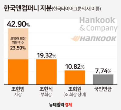 장남인 조현식 부회장의 지분율 19.32%, 장녀인 조희경 한국타이어나눔재단 이사장의 0.83%, 차녀인 조희원씨의 10.82%의 합 보다도 많았기 때문이다.