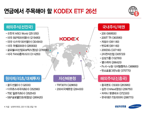 삼성자산운용은 ETF를 활용한 연금 투자에 관심을 가진 이들을 위해 엄선한 KODEX ETF 26종을 소개한다고 22일 밝혔다.연금 투자가 가능한 KODEX ETF 총 101종 중 지수의 대표성과 현 시점 주목받는 섹터 등을 고려해 분산투자에 적합한 26종을 투자자들에게 추천했다는 설명이다.삼성자산운용은 연금 투자를 위해 가장 적합한 ETF 라인업을 제공하기 위해 우선 장기적인 관점에서 국내외 가장 대표적인 지수를 고려했다.현재 매크로 환경, 투자심리, 투자자 동향을 바탕으로 주목하면 좋을 섹터·테마를 선정, 투자에 있어 가장 중요한 요소라 판단하는 자산배분을 위해 대체자산(골드, 리츠, 인프라) 및 혼합형 상품을 선정해 26개 라인업을 완성했다고 회사 측은 밝혔다.김도형 ETF컨설팅팀장은 “연금 시장에서 ETF에 대한 개인 투자자분들의 높은 관심으로 가이드북을 제작하며 유용한 정보와 다양한 상품을 제공하기 위해 많은 고민을 했다”면서 “앞으로도 ETF로 연금 투자자에게 최적의 솔루션을 제공하는 것이 목표”라고 밝혔다.