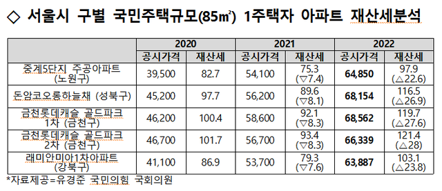 하지만 내년부터는 매년 10~30%씩 가파르게 증가한다는 게 유 의원의 설명이다. 실제 강북구의 경우 지난해 74만원에 불과했던 재산세가 2025년 163만원으로 120% 급증한 것으로 추계됐다. 또한 중랑구의 경우 165만원, 금천구 160만원, 도봉구 158만원으로 강북구와 비슷한 수준으로 급증하는 것으로 나타났다.