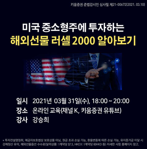 키움증권은 오는 31일 오후 6시부터 2시간 동안 채널K와 회사 유튜브을 통해 미국 중소형주에 투자하는 해외선물 러셀2000 투자전략을 주제로 상품 설명 및 시장 분석 세미나를 개최한다고 24일 밝혔다.경기 회복 기대가 커진 영향으로 미국 3대 주가지수가 호조를 보이고 있는 가운데 지난 18일 기준 3대 지수보다 더 높은 주가 상승률을 기록한 지수가 러셀 2000이다.이번 세미나에선 강승희 K-Fin자산운용 본부장이 강의를 진행할 예정이다.해외선물옵션에 관심 있는 고객이라면 누구나 무료로 신청할 수 있다. 회사 홈페이지를 통해 사전 세미나 참가 신청 시 시장분석 강의 자료를 무료로 다운로드할 수 있다.