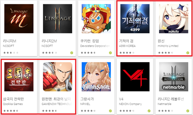 동북공정 논란으로 한동안 잠잠했던 중국 모바일게임이 다시 상승세에 접어들면서 국내 모바일게임 시장에 적신호가 들어왔다. 확률형 아이템 이슈까지 겹치면서 국산게임 위기론이 불거지고 있다.24일 업계에 따르면 구글 플레이스토어 매출 순위 Top10 중 4종이 중국산 게임이다. 2019년 출시 이후 꾸준히 매출 최상위권에서 경쟁 중인 기적의 검(4위)을 필두로 삼국지 전략판(5위), 원신(6위), 원펀맨: 최강의 남자(7위)가 이름을 올리고 있다. 순위를 넓게 봐도 상황은 크게 다르지 않다. Top100 중 3~40%가 중국 게임이다.중국 모바일게임은 지난 몇 년간 폭발적인 성장을 기록했다. 한국콘텐츠진흥원의 조사에 따르면 2014년 278억 9000만위안(한화 약 4조 8584억원)이었던 중국의 모바일게임 시장 규모는 지난해 2082억 6000만위안(한화 약 36조 2788억원)으로 6년 사이에 약 7.5배 성장했다.업계에서는 중국산 모바일게임이 양산형이란 평가를 받던 시기는 지나간지 오래이며, 콘텐츠의 양과 질에서 고도화를 이뤄냈다고 보고 있다. 중국의 개발력이 한국을 앞질렀다는 분석도 나오는 상황이다.중국 모바일게임이 국내 시장 성과는 두드러진다. 2020년 중국 게임산업 보고서에 따르면 지난해 중국 모바일게임의 해외 매출 비중의 8.81%가 우리나라에서 발생했다. 최근 몇 년 동안 중국 게임의 한국 매출 역시 증가하고 있는 추세다.더 큰 문제는 중국 게임들의 공습이 앞으로 더욱 거세질 것이란 점이다. 국산 게임의 경우 엔씨소프트의 리니지M(1위)과 리니지2M(2위), 데브시스터즈의 쿠키런: 킹덤(3위)과 엔픽셀의 그랑사가(8위), 넥슨의 V4(9위), 넷마블의 리니지2 레볼루션(10위)이 상위권에 이름을 올리고 있지만, MMORPG와 수집형RPG에 집중된 장르의 불균형이 약점으로 분류된다.국내의 경우 대다수의 게임사들이 인기 지식재산권(IP) 기반의 검증된 장르에 개발을 집중하고 있다. 새로운 게임성을 지닌 작품이 나오기 쉽지 않은 환경이다. 이는 기존 게임들이 흥행한 공식을 그대로 따르는 양산형 게임 개발이란 악순환으로 이어진다.