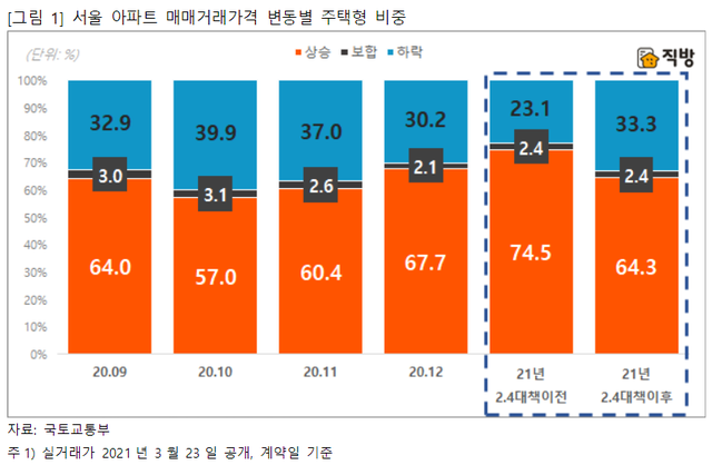 전월 대비 매매가격이 하락한 아파트 비중은 지난해 10월 39.9%까지 늘어난 이후 점차 감소추세가 이어졌다. 이후 2·4대책 발표 직전에는 23.1%까지 줄었다가 대책 발표 이후엔 10%포인트(p) 이상 오르며 매매시장이 안정세를 보이고 있는 것이다.