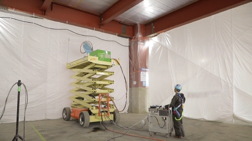 내화뿜칠은 건물 철골기둥과 보에 내화재를 덧칠해 높은 열에도 견딜 수 있게 하는 필수작업이다. 이 작업은 근로자가 유동성물질에 노출될 수 있는데다 높은곳에서 작업해야 하는 상황이 많아 고위험작업으로 분류된다.