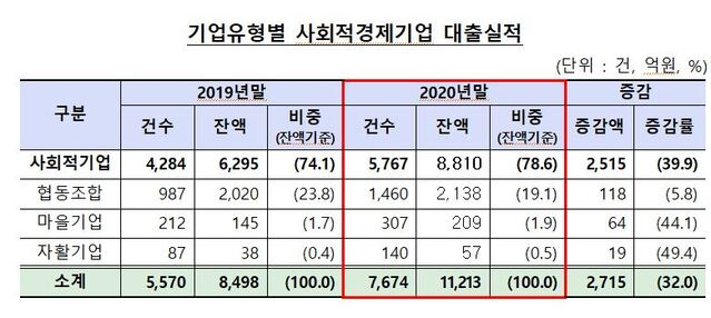 지난해 은행권의 사회적경제기업 대출 잔액은 1조1213억에 달한 것으로 집계됐다. 1년 전 8498억원보다 31.95%가 증가한 규모다.21일 금융위원회는 제 1차 사회적금융협의회를 열고 1분기 사회적금융 추진실적 점검 및 지난해 은행권의 사회적경제기업 지원실적을 살폈다. 이번 회의는 도규상 사무처장 주재로 온라인으로 이뤄졌다.특히 은행권의 사회적경제기업 실적이 큰 폭으로 늘었는데 사회적기업 대출 잔액이 2515억원이나 증가했다.기업 유형별로는 사회적기업이 8810억원으로 전체의 78.6%를 차지했고 협동조합 2138억원, 마을기업 209억, 자활기업 57억원으로 집계됐다.은행별로는 기업은행이 3102억원으로 가장 많았고 이어 신한은행(2257억원), 우리은행(1367억원) 등으로 나타났다. 또 대출 외 지원 분야도 활발했다. 기부·후원은 155억9000만원, 제품구매는 34억4000억원에 달했다.공공부문의 올 1분기 공급 실적 점검도 이뤄졌다.3월말 기준 총 574개사에 1010억원의 자금을 공급해 올해 공급목표인 5162억원 대비 20% 집행이 이뤄졌다.대출은 총 209개 기업에 294억원이 이뤄졌고 보증은 325개 기업에 635억원을, 투자는 총 13개 기업에 81억원 규모로 진행됐다.금융위는 "사회적금융 생태계 조성을 위해 공공부문을 중심으로 사회적 경제기업에 대한 자금공급을 지속적으로 확대할 것"이라며 "필요자금을 적기에 조달할 수 있도록 차질없이 집행할 것"이라 밝혔다.
