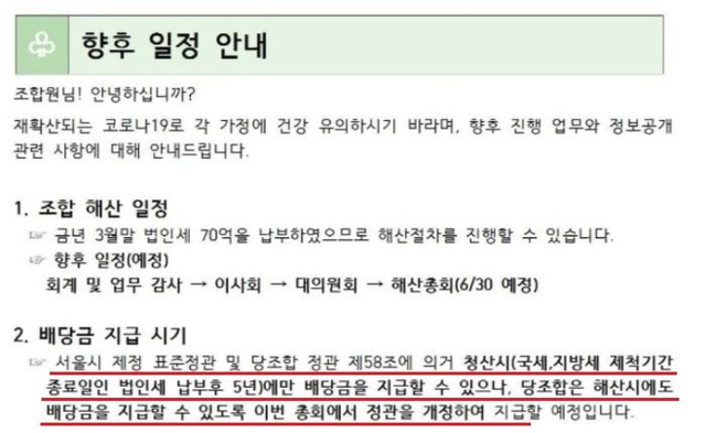 일정안내에 따르면 고덕센트럴아이파크 조합은 지난 3월말 법인세 70억원을 납부하고 해산절차에 돌입했다. 향후일정은 '회계 및 업무감사→이사회→대의원회→해산총회(6/30)' 순으로 진행될 예정이다.