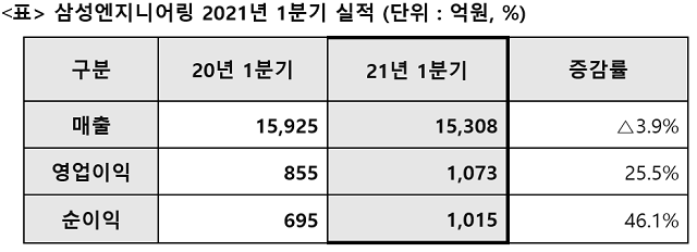 삼성엔지니어링은 잠정실적공시를 통해 올 1분기 매출 1조5308억원, 영업이익 1073억원, 순이익 1015억원을 기록했다고 29일 밝혔다. 전년동기대비 영업이익과 순이익은 각각 25.5%, 46.1% 증가했고 매출은 3.9% 소폭 감소했다.