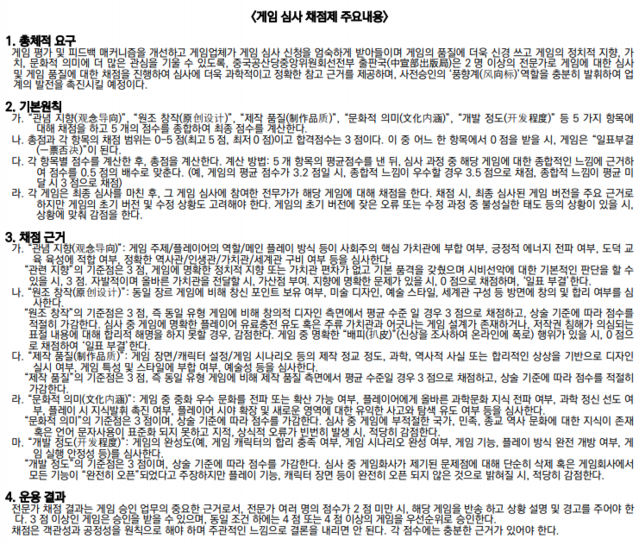 4월월부터 새로운 채점 제도 도입5개 항목 평균 3점 이상 받아야 발급 가능'관념 지향' 항목, 사회주의 사상 위배 시 불합격사실상 '문화 검열' 지적… '韓 게임사 中 진출 제약' 가능성