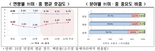 우리나라 국민 10명 중 8명은 미국이 중국보다 한국에 더 중요하다고 인식한다는 조사 결과가 나왔다. 정서적 호감도도 미국이 중국보다 높은 것으로 나타났다.전국경제인연합회는 여론조사기관 모노리서치에 의뢰해 20세 이상 남녀 1010명을 대상으로 실시한 조사 결과 이같이 나타났다고 3일 발표했다.전경련에 따르면 미국에 대한 한국 국민의 호감도는 10점 만점에 평균 6.8점이었다. 이는 중국에 대한 호감도(3.5점)의 두 배 가까운 수준이다. 우리나라 사람들이 아직 중국보다 미국을 더 친밀하게 느끼고 있다고 전경련은 설명했다.연령대별로 살펴보면 20대와 30대에서 미국에 대한 호감도는 각각 6.9점, 7.0점으로 나타나 다른 연령대보다 높았다. 반면 중국에 대한 호감도는 20대와 30대에서 각각 2.8점, 2.6점에 불과했다.실질적인 정책 면에서도 한국 국민은 미국을 중국보다 중요하게 생각하는 것으로 조사됐다. '경제적 번영'을 위해 미국이 필요하다는 응답률은 70.7%(중국 19.0%)였고, '한반도 평화' 때문에 미국과 더 좋은 관계를 유지해야 한다는 응답률은 75.9%(중국 16.0%)였다.종합적인 측면에서 한국에 더 중요한 국가를 묻자 응답자의 77.7%가 미국을 꼽았다. 중국을 택한 응답 비율은 12.7%에 그쳤다.하지만 이러한 격차는 향후 줄어들 것으로 관측됐다. 10년 후 한국에 중요한 국가를 묻는 말에 미국을 선택한 응답률은 65.7%로 현재보다 12.0%포인트 감소했다. 중국이 더 중요하다는 응답은 24.2%로 11.5%포인트 늘었다.미국을 중국보다 더 중요하다고 보는 이유로는 '자유민주주의, 시장경제의 동일한 가치 공유'(41.4%), '한반도 평화를 위한 중요한 안보 동맹'(35.9%), '세계 1위 경제 대국과의 협력 강화'(16.2%) 순으로 답이 나왔다.중국을 선택한 이유는 가장 많은 55.4%가 '14억 인구 거대시장에 따른 경제적 협력 기회'(55.4%)를 꼽았다.대미외교정책 우선순위 방향으로는 '한미 군사동맹 협력 강화(38.4%)', '북한 비핵화를 위한 정책공조(22.4%)', '반도체 등 글로벌 산업공급망 재편 협력'(19.4%), '중국 부상에 대한 공동대응'(12.7%) 등이 꼽혔다.대중외교정책 우선순위는 '한반도 통일을 위한 협력 강화'가 39.9%로 가장 높은 응답률을 보였다.김봉만 전경련 국제협력실장은 "미중 갈등 심화로 한국의 외교가 쉽지 않은 가운데 향후 대외정책에 있어 국민의 의견이 반영되길 바란다"고 말했다.