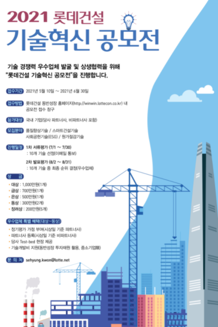 롯데건설이 우수기술을 보유한 협력회사 발굴에 나선다.롯데건설은 제1회 롯데건설 기술혁신 공모전을 개최한다고 4일 밝혔다.공모전을 통해 미래 건설산업을 선도할 우수기술 발굴 플랫폼을 구축하고 우수기업 기술개발, 현장 적용을 지원해 상생협력 강화와 지속적인 성장 동력을 동시에 확보할 계획이다.공모전 서류 접수는 오는 10일부터 내달 30일까지 진행된다. 롯데건설 동반성장 홈페이지에서 기술소개서 등 관련서류를 제출할 수 있다.모집분야는 품질향상기술, 스마트건설기술, 사회공헌기술(ESG), 원가절감기술로 나뉜다. 7월 서류 평가를 통해 10개 기술을 선정하고 발표평가를 거쳐 8월 말 최종 순위를 발표할 예정이다.시상은 서류평가를 통과한 10개 기술에 대상(1000만원)부터 장려상(200만원)까지 총 3800만원의 상금을 지급한다.선정된 우수기업은 정기평가 가점 부여, 파트너사 등록, 테스트베드 현장 제공, 기술개발비 지원 등 각종 혜택을 제공한다.롯데건설 관계자는 "공모전을 통해 파트너사 또는 비파트너사 우수한 기술 아이디어를 발굴해 기술개발을 지원하고 당사 현장에 시험 적용을 통해 상생협력 및 동반성장에 앞장서겠다"고 말했다.