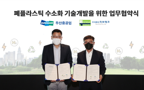 두산중공업이 폐플라스틱·폐비닐(이하 폐플라스틱)을 활용한 수소생산 기술 개발에 나선다.폐플라스틱 연속식 열분해 전문기업인 리보테크와 6일 MOU를 체결했다.리보테크는 폐플라스틱을 연속식으로 열분해해서 가스를 생산하고, 두산중공업은 열분해 가스를 수소로 개질하는 핵심설비와 공정개발을 맡는다.이번에 적용하는 연속식 열분해 기술은 원료의 지속 투입으로 연속 생산을 할 수 있어 처리규모를 쉽게 확대할 수 있고 경제성도 확보할 수 있다.두산중공업은 연내 하루 0.3톤 가량의 수소를 생산할 수 있는 수소 개질기를 개발해 경상북도 문경시에 위치한 리보테크에 설치, 운전할 예정이다. 이후 실증과제를 통해 폐플라스틱으로부터 하루 3톤 이상의 수소를 생산할 수 있도록 기술을 상용화에 나선다.송용진 두산중공업 부사장은 "매년 국내에 800만톤 이상의 폐플라스틱이 배출되는데, 이 중 매립, 소각 및 SRF(고형폐기물) 원료가 되는 약 400만톤의 폐플라스틱에 이 기술을 적용할 수 있다"며 "폐플라스틱 수소화로 자원순환과 탄소중립 실현에 기여하는 것은 물론 생산된 수소는 추후 연료전지, 수소가스터빈 등에 활용 할 수 있다"고 말했다.