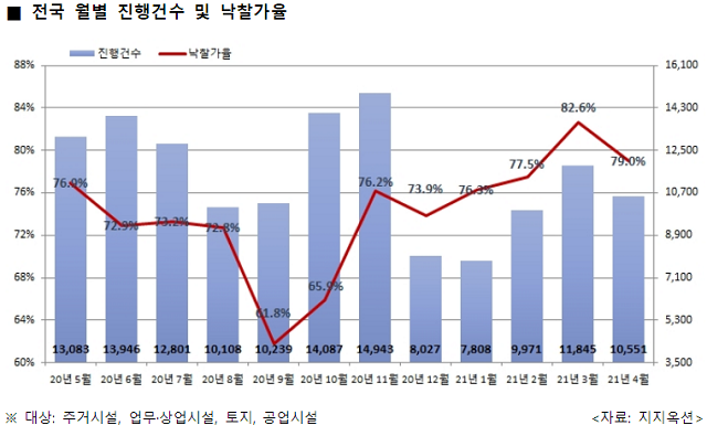 10일 법원경매 전문기업 지지옥션이 발표한 '4월 경매동향보고서'에 따르면 전국 경매 진행건수는 1만551건으로 이중 4268건이 낙찰돼 40.5%의 낙찰률을 기록했다.