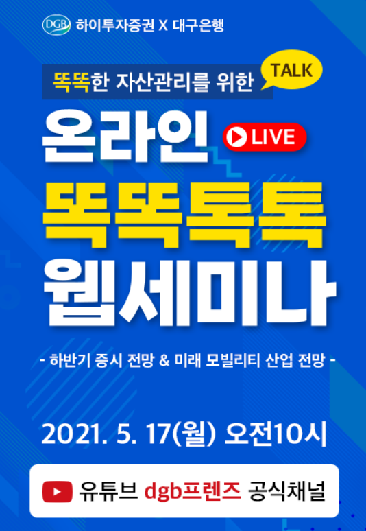 하이투자증권은 DGB금융그룹 창립 10주년을 기념해 대구은행과 함께 5월 17일 온라인 웹세미나를 개최한다고 11일 밝혔다.본 웹세미나는 ‘2021년 하반기 증시 및 미래 모빌리티 산업 전망’이라는 주제로 대구은행 유튜브 채널 ‘dgb프렌즈’를 통해 오전 10시부터 1시간 동안 실시간 스트리밍으로 진행될 예정이다.강사로는 하이투자증권 리서치본부의 고태봉 본부장과 조익재 전문위원이 나선다. 조익재 전문위원이 하반기 증시 전망에 대해 강연하고, 고태봉 본부장이 미래 모빌리티 산업 전망에 대해 강연할 예정이다.웹세미나는 유튜브에서 ‘dgb프렌즈’ 채널 검색을 통해 참석할 수 있다.회사 관계자는 “DGB금융그룹 창립 10주년을 기념해 처음으로 웹세미나를 준비했다”며 “최근 증시가 횡보하는 모습을 보이고 있는 상황에서 본 웹세미나가 투자기회를 파악하는 데 좋은 기회가 될 것”이라고 설명했다.