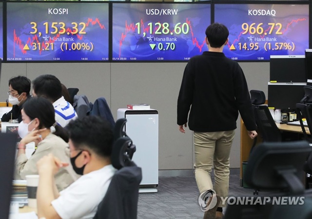 코스피가 개인과 기관 동반 매수에 4일 만에 반등 마감했다.14일 코스피는 전 거래일 대비 31.21포인트(1.00%) 오른 3153.32에 장을 마쳤다.전날 뉴욕 증시는 산업 대표주와 기술주 반등으로 상승 마감했다.다우존스 30 산업평균지수는 전 거래일보다 1.29%, 스탠더드앤드푸어스(S&P) 500 지수는 1.22%, 기술주 중심의 나스닥 지수는 0.72% 올랐다.코스피 지수는 전 거래일 대비 9.24포인트(0.30%) 오른 3131.35에 출발했다. 이후 상승 폭을 확대하며 장중 한 때 3160선까지 오르기도 했다.투자자별로 개인과 기관이 각각 3848억원, 395억원 순매수했다. 반면 외국인은 4193억원 순매도했다.거래량은 8억2249주, 거래대금은 14조2178원으로 집계됐다.업종별로 제약(3.38%), 전기제품(2.78%), 방송과엔터테인먼트(2.51%), 건강관리업체및서비스(2.51%), 복합기업(2.47%) 등이 올랐다.반면 생명보험(-2.56%), 해운사(-2.25%), 비철금속(-2.03%), 철강(-1.74%), 다각화된통신서비스(-1.62%) 등은 하락했다.시가총액 상위종목 가운데 삼성전자는 전 거래일 대비 1600원(2.04%) 오른 8만100원에 거래를 마쳤다. SK하이닉스(0.85%), 삼성바이오로직스(9.47%), LG화학(0.47%), NAVER(1.48%), 삼성SDI(3.99%), 셀트리온(2.08%) 주가도 상승했다.현대차와 카카오는 각각 0.22%, 0.46% 내렸다.삼성바이오로직스가 모더나의 코로나19 백신 위탁생산 기대감에 7거래일 연속 강세다. 주가는 전 거래일 대비 9.47% 오른 94만8000원에 장을 마쳤다.네이버가 디지털화폐 플랫폼 시장에 뛰어든다는 소식에 디지털 화폐 관련 종목이 주목을 받았다. 케이씨티(7.36%), 한네트(2.12%), 한국전자금융(1.14%), 케이씨에스(0.98%) 등이 나란히 올랐다.상승 종목은 상한가 2개를 포함해 504개, 하락 종목은 하한가 없이 343개로 집계됐다.코스닥은 전 거래일보다 14.95포인트(1.57%) 오른 966.72로 마감했다.상승 종목은 상한가 3개를 포함해 893개, 하락 종목은 하한가 1개를 포함 415개로 집계됐다.한편 원-달러 환율은 0.7원 내린 1128.6원에 거래를 마쳤다.